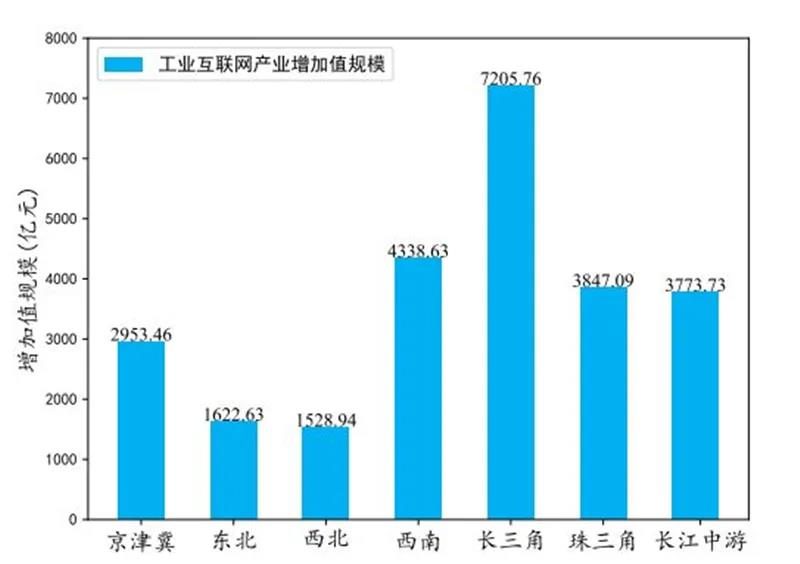 從工業互聯網產業增加值規模來看, 如下圖所示,據測算, 2019 年,長三角地區工業互聯網產業增加值規模最高,達到 7205.76 億元,西南地區和珠三角地區次之,產業增加值規模分別為 4338.63 億元和 3847.09 億元,東北地區和西北地區產業增加值規模較低,為 1622.63 億元和 1528.94億元,這也和各個地區的生產總值呈現出較強的相關性。