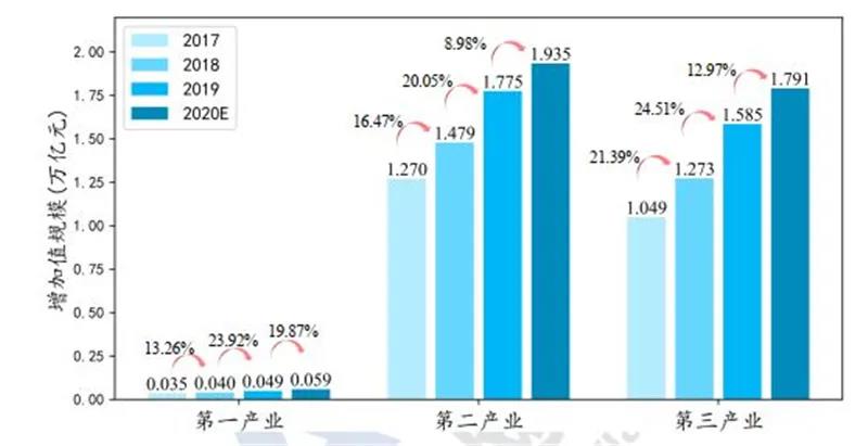 如上圖所示, 據測算, 2019 年,工業互聯網帶動第一產業、第二產業、第三產業的增加值規模分別為 0.049 萬億元、 1.775 萬億元、 1.585 萬億元,名義增速分別為 23.92%、20.05%、 24.51%,增速同比增長 9.41%、 3.08%、2.57%,工業互聯網帶動各行業的增加值規模持續提升。在疫情和經濟下行影響下,預計 2020 年工業互聯網帶動三大產業增加值規模仍將高速提升,工業互聯網帶動第一產業、第二產業、第三產業的增加值規模將分別達到 0.059 萬億元、 1.935 萬億元、 1.791 萬億元。