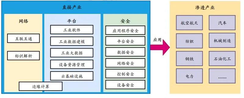 工業互聯網為實體經濟各個領域的轉型升級提供具體的實現方式和推進抓手,為產業變革賦能。 工業互聯網的產業體系包括直接產業和滲透產業。工業互聯網直接產業由網絡、平臺、安全三個部分構成,其中網絡是基礎、平臺是核心、安全是保障。如圖 1所示,“網絡”是實現各類工業生產要素泛在深度互聯的基礎,包括網絡互聯互通體系和標識解析體系。