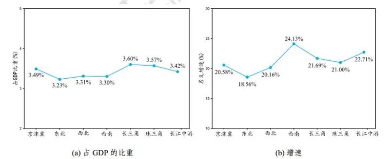 從工業互聯網產業增加值規模占 GDP 的比重來看,如下圖(a) 所示,據測算,各區域的工業互聯網產業增加值規模占 GDP 的比重均在 3%4%之間,其中長三角地區占 GDP 的比重最高,達到 3.60%,珠三角地區和京津冀地區緊隨其后,分別為 3.57% 和 3.49%,東北地區、西南地區和西北地區的比重則分別為 3.23%, 3.30% 和 3.31%。