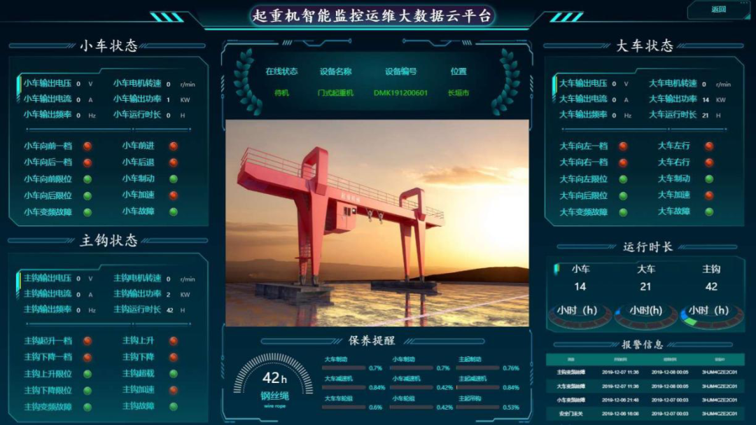 在設備安裝調試期間,云運維有效提高50%以上的調試效率。在設備使用期間,統一的設備云運維平臺、以及全世界范圍內的監控知識與監控數據共享,實現了起重設備的預防性維護、實時跟進、動態管理,非預測性停機降低20%以上,安全事故發生概率降低80%以上,極大的提高了起重機有效工作效率和穩定性。在設備淘汰期間,依靠起重設備大數據分析系統,對于即將淘汰的起重設備實現提前預警,在最大化設備使用價值的同時,為企業保證正常生產的前提下更換設備預留了充足時間。