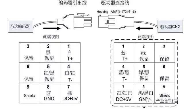 從上圖看出九個端子我們只使用了5個,一個屏蔽線、電源線兩根、串行通訊信號(+-)兩根,與我們普通的編碼器接線差不多。