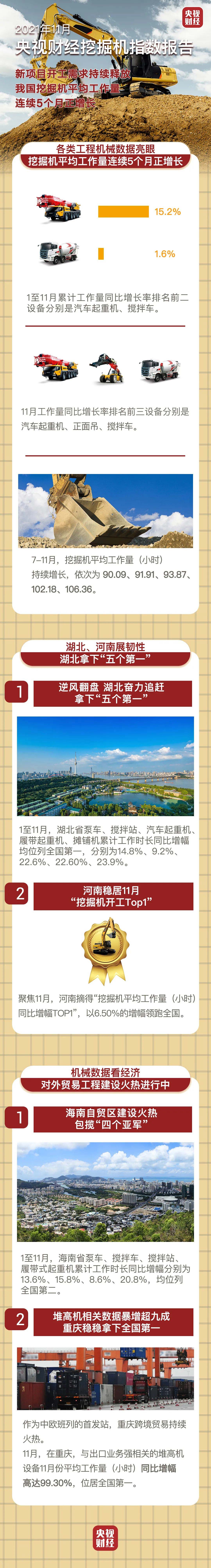 挖掘機(jī)是基礎(chǔ)設(shè)施建設(shè)的“標(biāo)配”,是反映基礎(chǔ)設(shè)施建設(shè)、觀察固定資產(chǎn)投資等經(jīng)濟(jì)變化的風(fēng)向標(biāo)。央視財(cái)經(jīng)與三一重工、樹根科技聯(lián)合打造的“央視財(cái)經(jīng)挖掘機(jī)指數(shù)”今天發(fā)布了11月份相關(guān)數(shù)據(jù)。央視財(cái)經(jīng)挖掘機(jī)指數(shù)顯示,各省份表現(xiàn)亮眼,河南穩(wěn)居11月“挖掘機(jī)開工Top1”,湖北則拿下“五個(gè)第一”。具體有哪些變化?戳長(zhǎng)圖,我們一起來了解一下。