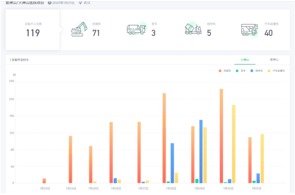 我們有一個(gè)產(chǎn)品叫應(yīng)急裝備智能管理平臺(tái),大家看到這個(gè)界面里面,我們統(tǒng)計(jì)有400多臺(tái)在我們平臺(tái)上的設(shè)備去支援了火神山、雷神山的建設(shè),為武漢的抗疫做出了一定貢獻(xiàn),這個(gè)柱狀圖是我們每天在火神山、雷神山施工實(shí)時(shí)的情況,而且在平臺(tái)的支持下也有效彌補(bǔ)現(xiàn)場(chǎng)服務(wù)工程師不足的問題。