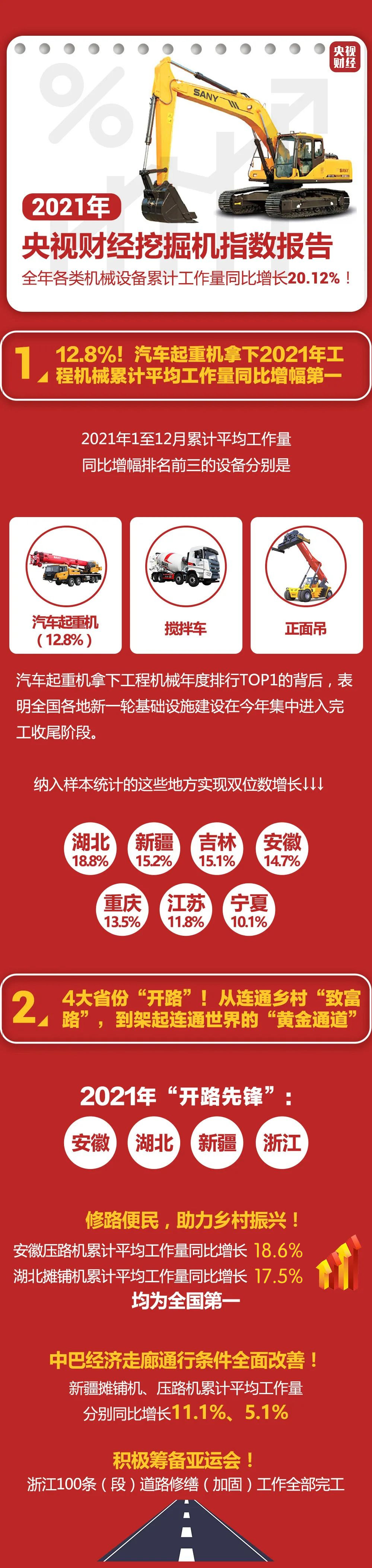2021年我國持續(xù)加大基礎(chǔ)設(shè)施建設(shè)力度,為社會經(jīng)濟發(fā)展注入強勁動力。央視財經(jīng)挖掘機指數(shù)顯示,2021年我國各類工程機械設(shè)備累計工作量同比增長20.12%!
