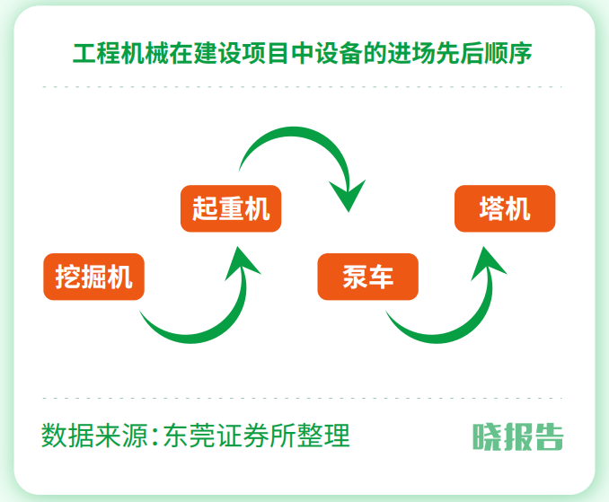 蓋一棟樓,要先挖坑打地基、再打柱梁,一層層往上蓋。對應到主要三大設備,出場順序大致是:挖掘機—攪拌車—塔機。