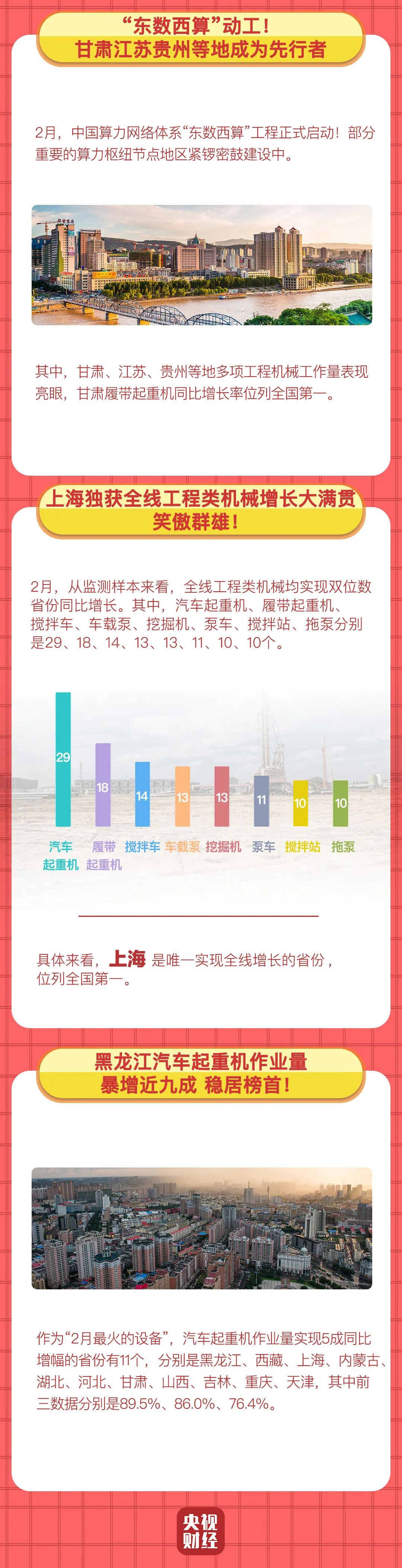 央視財經挖掘機指數顯示,2月份,甘肅、江蘇、貴州多項工程機械作業量實現同比增長,其中甘肅多項工程機械作業量表現亮眼,履帶起重機同比增長率位列全國第一。