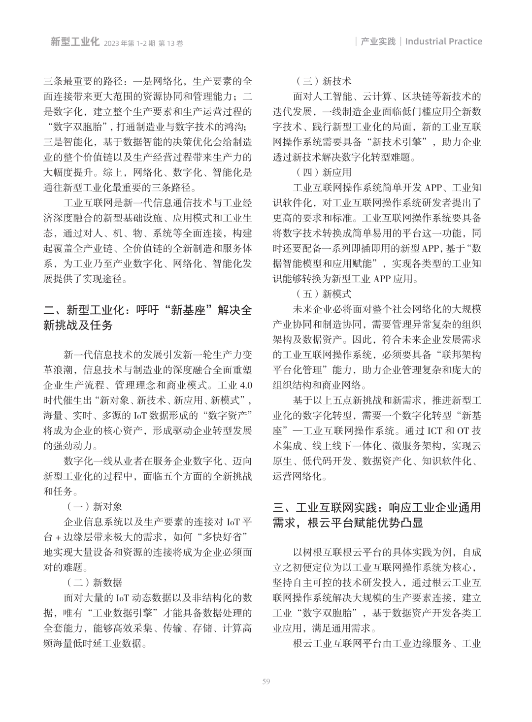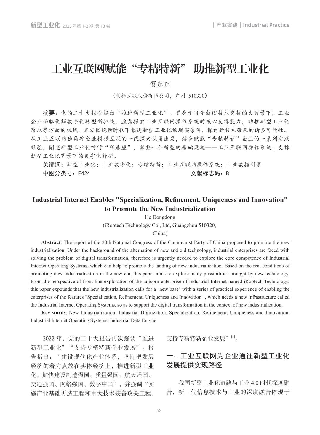 今天,由工信部主管、國家工業信息安全發展研究中心主辦的國家級專業期刊——《新型工業化》2023年首刊正式發布,以“新一代信息技術賦能新型工業化”為主題,圍繞理論探索、政策解讀、數據洞察、學術爭鳴、產業實踐等內容板塊,分別刊發了中央黨校(國家行政學院)科學社會主義教研部、中國企業聯合會、國家工業信息安全發展研究中心、河北省工業和信息化廳、樹根科技、清華大學、中國電子科技集團公司第十四研究所等來自政產學研界專家的學術著作,為推動新型工業化建設提供智庫支持。