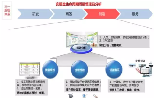 18號智能工廠通過GSP、MES、CSM及QIS的整合應用,實現了涵蓋供應商送貨、零件制造、整機裝配、售后服務等全生命周期的質檢數字化,以及SPC分析、質量追溯等功能。