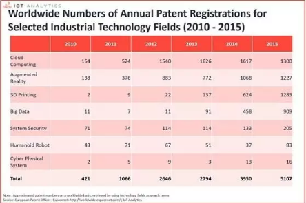 IoT Analytics分析了世界范圍內從2010-2015年申請的相關專利數,專利數可以看做是創新活動的一個重要指標。