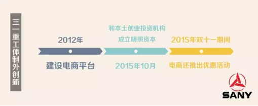 當然,三一不只是跨界者,還需要防御被跨界。2012年,三一重工開始建設(shè)電商平臺,嘗試在傳統(tǒng)銷售環(huán)節(jié)的代理商模式中引入互聯(lián)網(wǎng)電商,2015年雙十一期間,三一重工還推出優(yōu)惠活動,電商上的數(shù)據(jù)表現(xiàn)很理想。