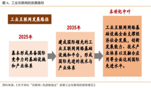 2017 年 11 月底,國務院發布《關于深化“互聯網+先進制造業”發展工業互聯網的指導意見》,2018 年 2 月 24 日,經國家制造強國建設領導小組會議審議,決定在國家制造強國建設領導小組下設立工業互聯網專項工作組,由工信部部長苗圩擔任組長,每年召開會議,探討工業互聯網重大事項。專項小組的成立體現了政策面對工業互聯網的高度重視,根據去年的《指導意見》,工業互聯網的發展將實施“三步走”戰略: