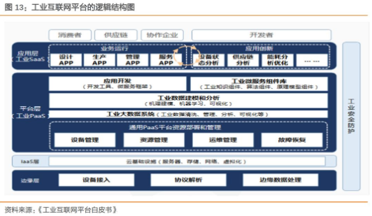 2、 工業 PaaS(平臺層)是核心。當前,工業 PaaS 建設的總體思路是通過對通用 PaaS 平臺的深度改造,構造滿足工業實時、可靠、安全需求的云平臺,將大量工業技術原理、行業知識、基礎模型規則化、軟件化、模塊化,并封裝為可重復使用和靈活調用的微服務,降低應用程序開發門檻和開發成本,提高開發、測試、部署效率,為海量開發者匯聚、開放社區建設提供支撐和保障。