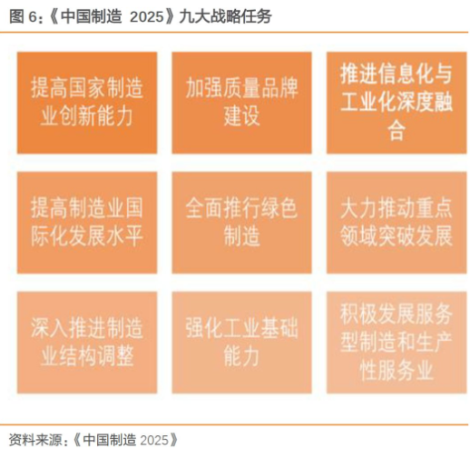 圍繞實現制造強國的戰略目標,《中國制造 2025》明確了 9 項戰略任務和重點,并明確提出,通過政府引導、整合資源,實施國家制造業創新中心建設、智能制造、工業強基、綠色制造、高端裝備創新等五項重大工程,實現長期制約制造業發展的關鍵共性技術突破,提升我國制造業的整體競爭力。