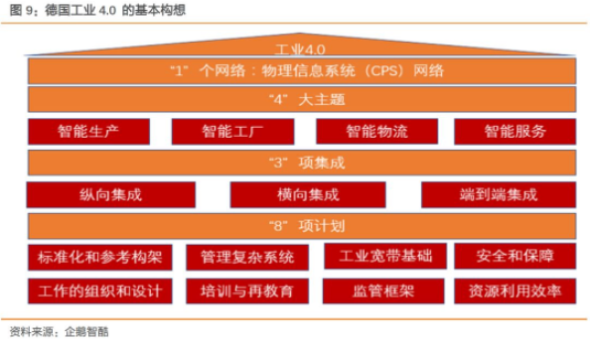 德國“工業 4.0”相當于美國的“工業物聯網”、中國的“中國制造 2025”。德國工業 4.0的戰略要點是建設一個網絡,研究四大主題,實現三項集成,實施八項計劃: