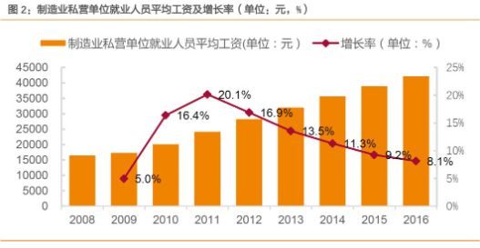制造業薪酬大幅提高,制造業企業承壓明顯。隨著體力勞動適齡人口下降, 我們認為中國在未來將面臨體力勞動力短缺的狀況,制造業人員平均工資增長,人力成本上升,人口紅利隨之消失。2016 年制造業從業人員平均工資達到了 4.2 萬元/年,而生產人員的工資達到了將近 4.7 萬元/年,勞動力成本的持續上升已經成為企業的頭號挑戰。