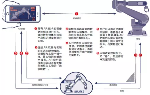 《哈佛商業(yè)評(píng)論》中文最新一期刊登了管理大師邁克爾波特和PTC的CEO Heppelmann聯(lián)合發(fā)布的文章《管理者的AR指南》。普通用戶可以下載這篇文章,只需要借助簡單的手機(jī)APP,就可以看到紙面上跳出來真實(shí)運(yùn)轉(zhuǎn)的機(jī)器人,和機(jī)器人的數(shù)字孿生模型在不斷地跳閃著工作狀態(tài)。