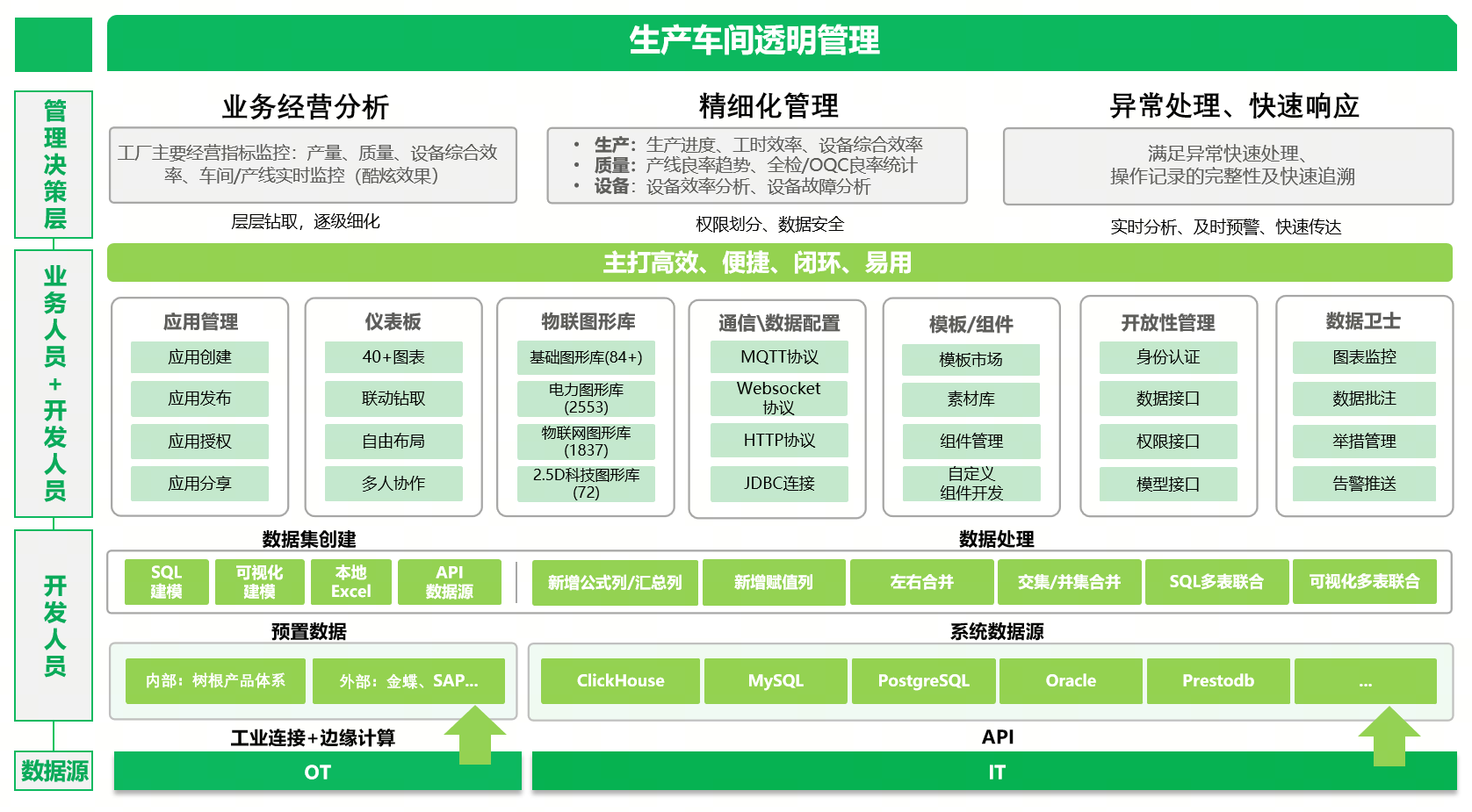 快速落地生產看板,主要針對生產車間的日、周、月產量,計劃達成率、生產異常、異常原因跟蹤,設備運行情況,車間人員在崗等情況,融合業務及生產設備數據,準實時展現生產現狀。